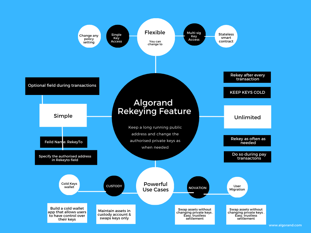 Algorand blockchain network recently launched the rekeying feature to give users the to change private keys to an Algorand address in simple, flexible and unlimited manner. Users can keep their accounts secure by maintaining cold keys while they perform transactions.